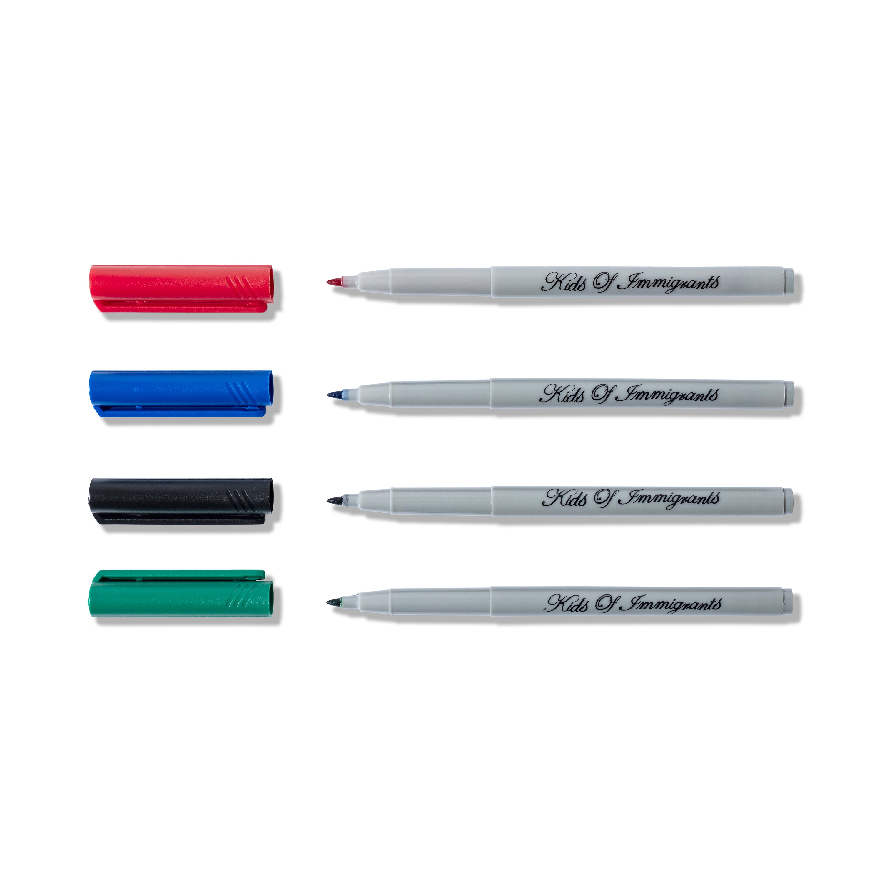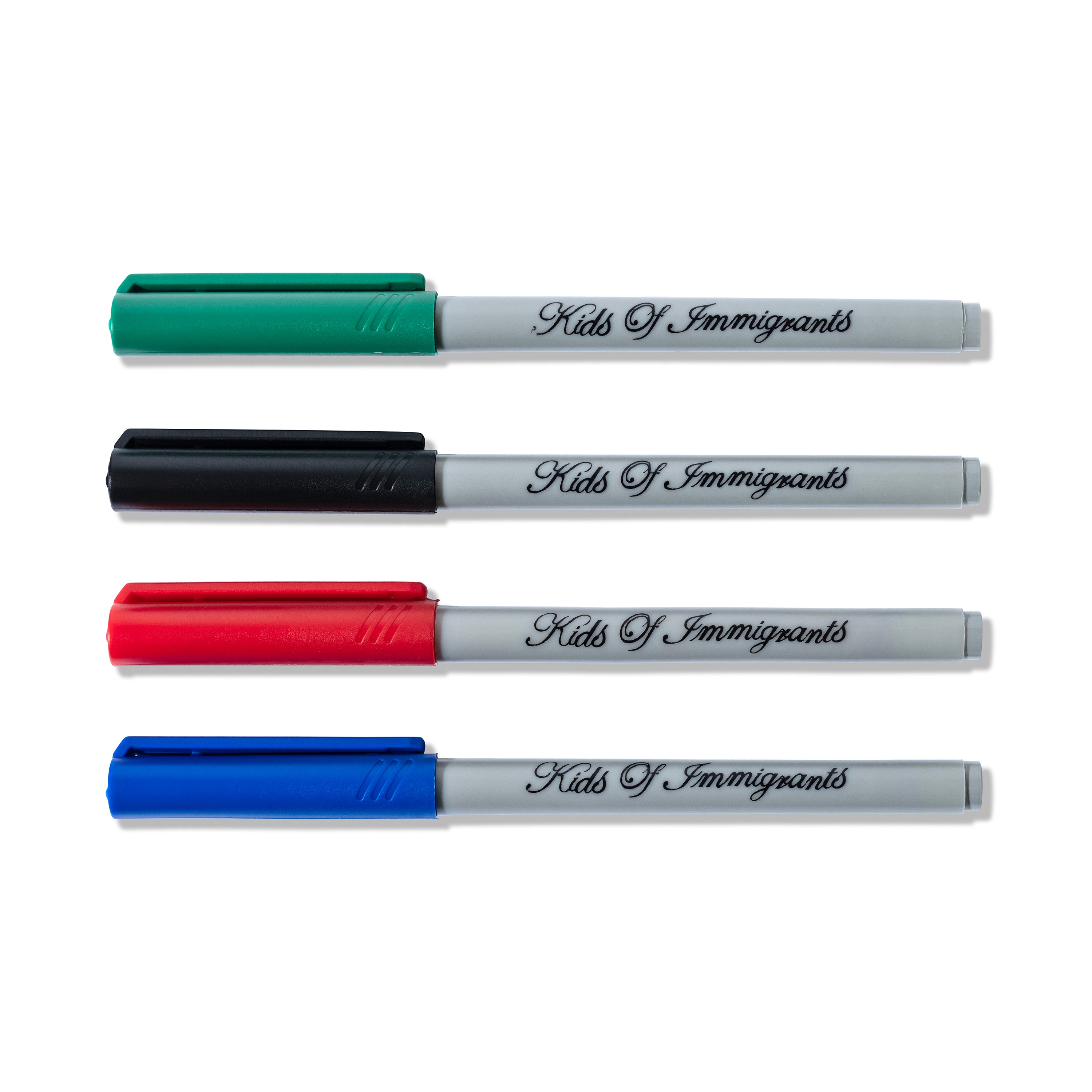 This four-pack of markers features our Kids of Immigrants script logo and includes four different colors: Red, Green, Black, and Blue.
