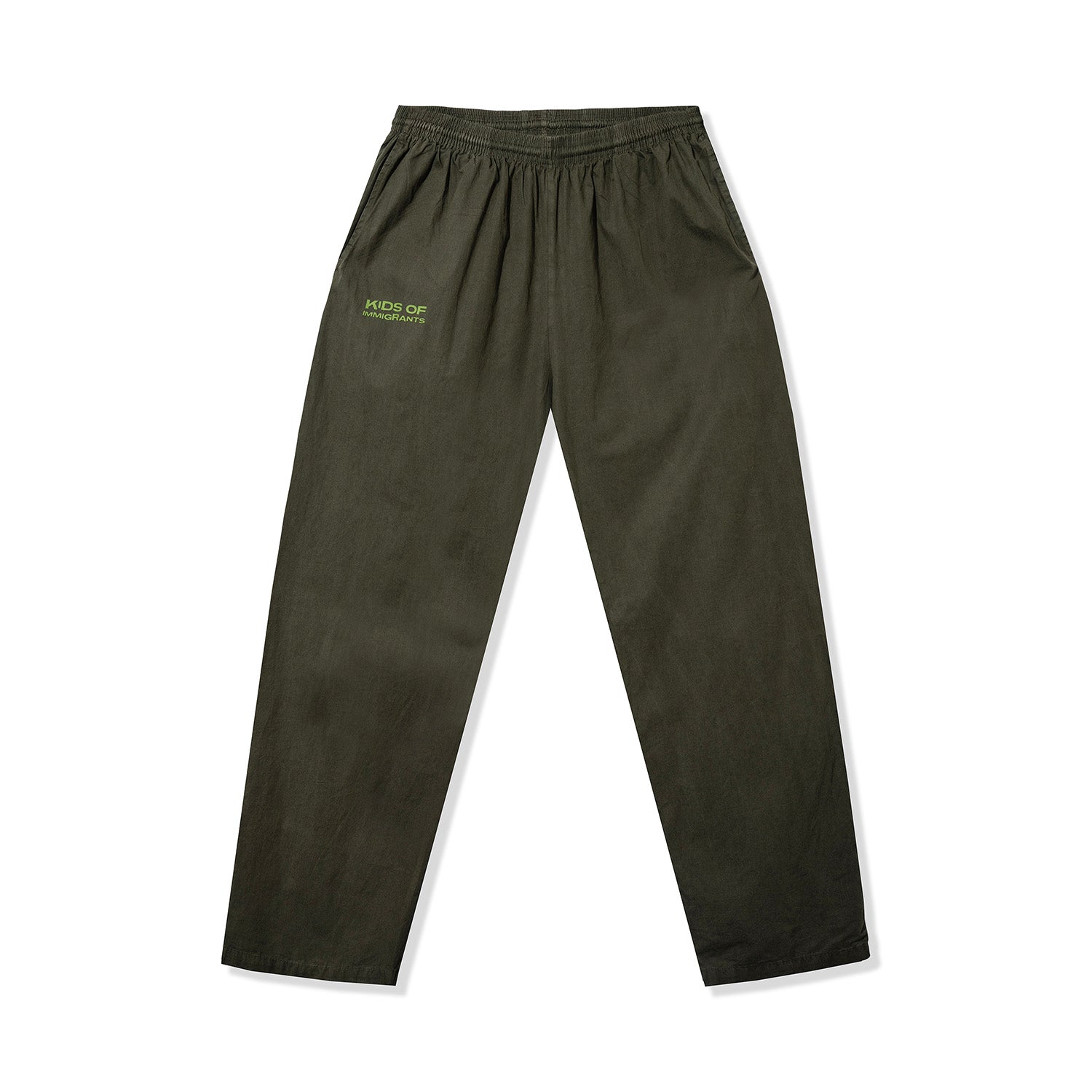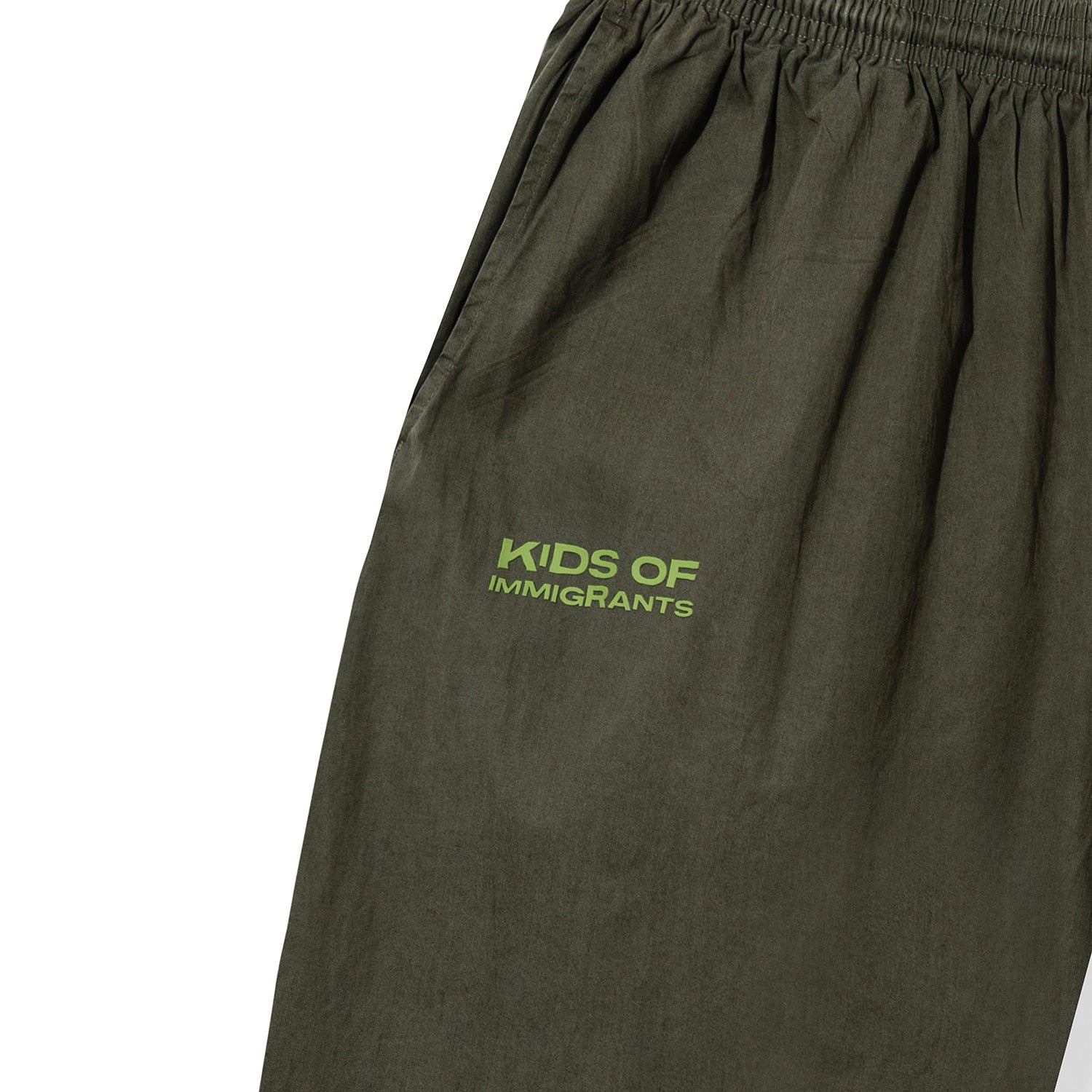 Made in Los Angeles, this lightweight poplin jacket pant. It is finished with a silicone Kids of Immigrants appliqué on the right leg.