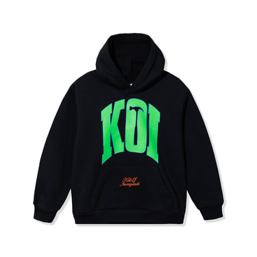 A kids hooded pullover sweatshirt, featuring a screen-printed front, is constructed from heavy 14 oz. fleece built to withstand playground adventures.